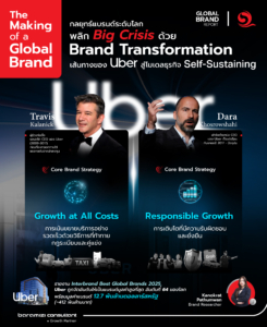 อย่างไรก็ดี หากย้อนดูเส้นทางตั้งแต่เริ่มต้น Uber ถือเป็นหนึ่งในแบรนด์ที่ต้องเผชิญกับวิกฤติและปัญหาหลากหลาย ทั้งในระดับองค์กรและระดับชาติ บางประเด็นถึงขั้นเกี่ยวพันกับกฎหมายของหลายประเทศ โดยเฉพาะในช่วงปี 2017 ซึ่งถือเป็นจุดเปลี่ยนสำคัญ เมื่อ Travis Kalanick ผู้ก่อตั้งและ CEO ต้องประกาศลาออกภายใต้แรงกดดันจากนักลงทุนใหญ่ การตัดสินใจครั้งนั้นไม่เพียงเป็นข่าวใหญ่ในวงการธุรกิจ แต่ยังเป็นสัญญาณชัดเจนว่า Uber จำเป็นต้องเข้าสู่กระบวนการ Brand Transformation อย่างแท้จริง เพื่อกอบกู้ความเชื่อมั่นของผู้มีส่วนได้ส่วนเสีย และสร้างโมเดลธุรกิจที่แข็งแกร่งและสามารถดำเนินไปได้ด้วยตนเอง (Self-Sustaining) ในระยะยาวให้กลายเป็นแบรนด์ระดับโลกได้ (Global Brand)