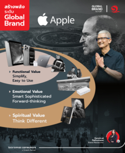 Apple คือหนึ่งในแบรนด์ที่พิสูจน์ได้ชัดว่า การสร้างคุณค่าในทุกระดับคือหัวใจของการสร้างพลังระดับ Global Brand จากการออกแบบที่ตอบโจทย์การใช้งานในชีวิตจริง (Functional Value) สู่การเชื่อมโยงความรู้สึกของผู้ใช้กับแบรนด์ (Emotional Value) และก้าวไปถึงระดับสูงสุดของคุณค่า (Spiritual Value) ซึ่งไม่ได้เกิดจากภาพลักษณ์หรือคำโฆษณา แต่เกิดจาก “ผลลัพธ์ที่เปลี่ยนชีวิตผู้คนให้ดีขึ้น”