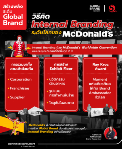 หนึ่งในไฮไลท์สำคัญของ McDonald’s Worldwide Convention คือการมอบ Ray Kroc Award ซึ่งเป็นรางวัลสูงสุดสำหรับผู้จัดการร้าน (Restaurant Managers) ที่มีผลงานโดดเด่นที่สุดในระบบ McDonald’s ทั่วโลก โดยคัดเลือกเพียง 1% ของผู้จัดการร้านทั้งหมด (คิดเป็น 365 คนในปีล่าสุด) เพื่อขึ้นรับรางวัลบนเวทีระดับโลก แสดงให้เห็นว่าพนักงานที่อยู่หน้างานที่ขับเคลื่อนร้านในแต่ละประเทศ คือบุคคลที่สำคัญที่สุดขององค์กร กรณีของ McDonald’s สะท้อนให้เห็นอย่างชัดเจนว่า การสร้าง Global Brand ไม่ได้เกิดจากการสื่อสารแบรนด์ออกสู่ภายนอกเพียงอย่างเดียว แต่ต้องเริ่มจากการลงทุนใน Internal Branding อย่างเป็นระบบ เพื่อหลอมรวมกลยุทธ์ เทคโนโลยี วัฒนธรรม และผู้คนในองค์กรให้เข้าใจและขับเคลื่อนไปในทิศทางเดียวกัน จนสามารถส่งมอบมาตรฐานและประสบการณ์ของแบรนด์ได้อย่างสม่ำเสมอในทุกประเทศทั่วโลก