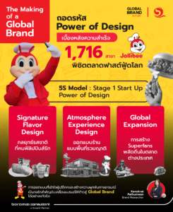 กลยุทธ์ที่จะทำให้แบรนด์เติบโตและแตกต่างเหนือคู่แข่งได้ จึงเน้น การสร้างความแตกต่างด้วย พลังการออกแบบ (Power of Design) ซึ่งเป็นกุญแจสำคัญในการสร้างทั้ง Product Differentiation และ Brand Identity ผู้ประกอบการทุกคนจึงต้องโฟกัสการสร้าง Power of Design เป็นฐานแรกของแบรนด์ ซึ่ง Jollibee ก็ได้วางรากฐานด้านการออกแบบผลิตภัณฑ์และประสบการณ์ลูกค้าอย่างแข็งแกร่งตั้งแต่เริ่มต้น