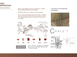 3.1 Iconic : การออกแบบ Logo ใช้จุดเด่นของการขึ้นโครงสร้างด้วยไม้ โดยใช้เทคนิค “การเข้าไม้” โดยสื่อถึงการผสมผสาน, การมีส่วนรวมและการร่วมมือกัน โดย ยึด ตัวอักษร ตัวแรกของ แบรนด์ CHALE’T คือตัว C โดยใช้เส้น 8 เส้น มาเรียงซ้อนกันจากแนวคิด อายตนะ รูป เสียง กลิ่น รส สัมผัส และอารมณ์ เพิ่มอีก 2 เส้น คือ CHALE’T และ ผู้บริโภค